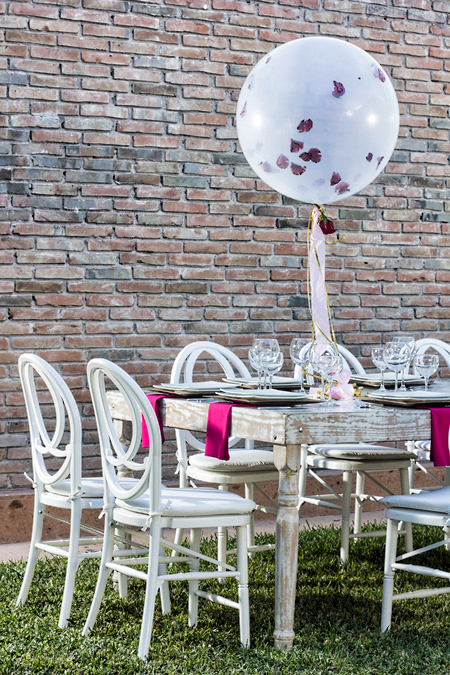 El centro de mesa puede ser algo menos formal que el que recomendé para la cena de pareja, pero más divertido. Puedes utilizar globos gigantes con motas de colores o que contengan papel de china picado y pétalos de rosa en el interior. Además puedes poner sobre la mesa confetti de corazones, velas, y dulces para sobrecargar la decoración.
