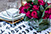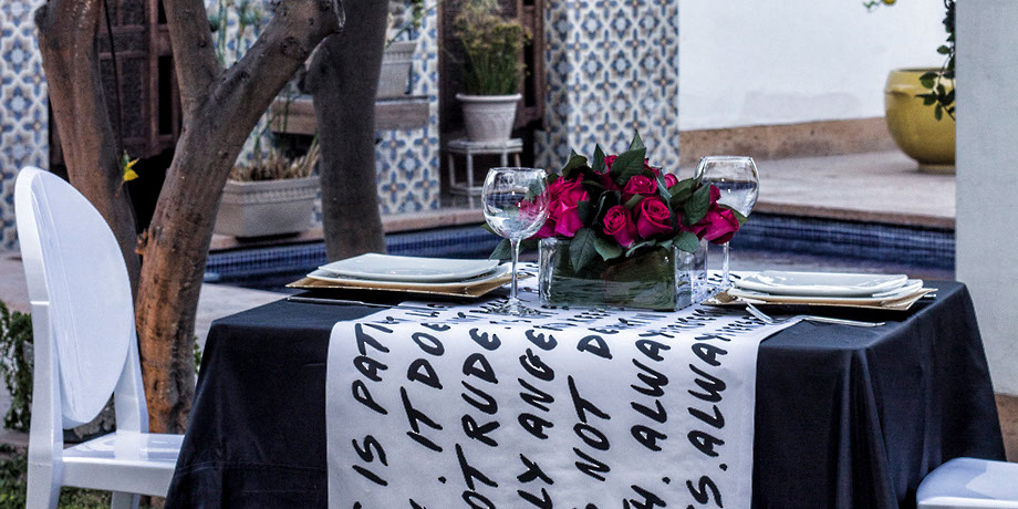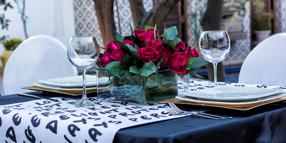 En la imagen puedes ver como yo puse un mantel negro y un cubremantel de papel blanco con la impresión de un verso famoso.